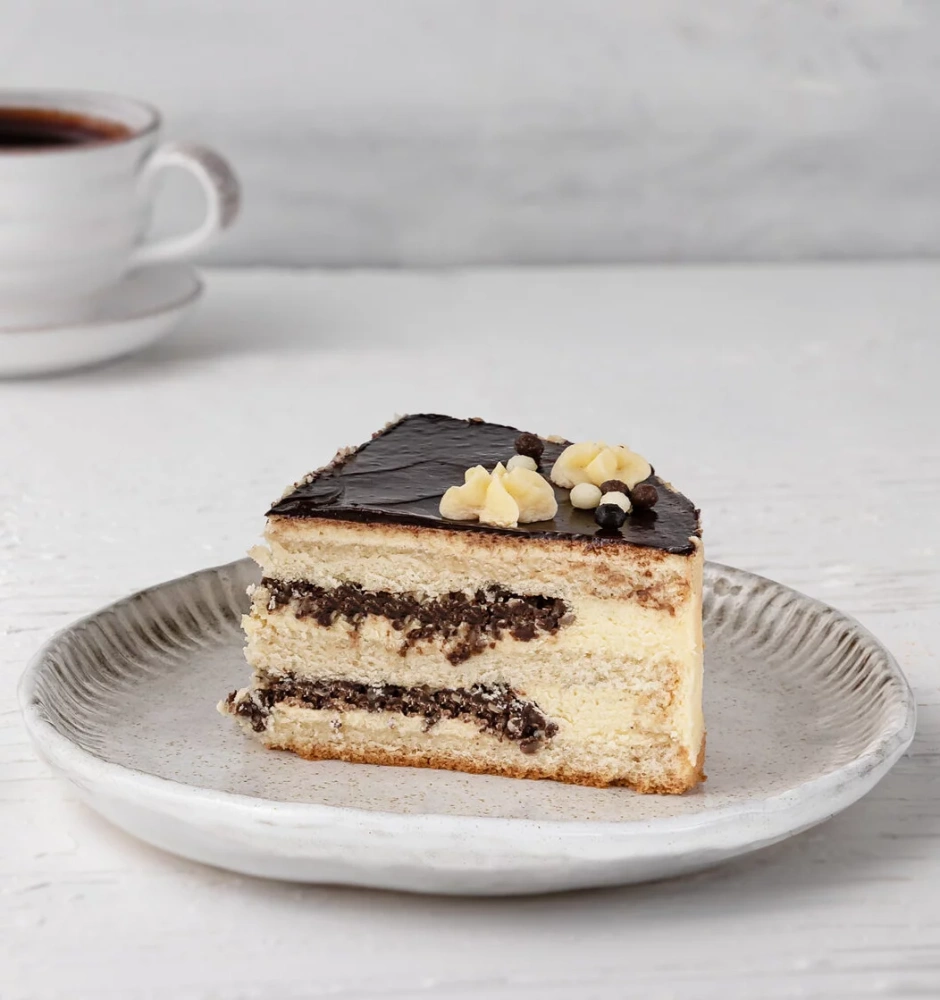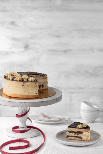 Три слоя халвичного бисквита, пропитанные сладким сиропом, с добавлением нежнейшего сливочно-заварного крема. Торт заглазирован шоколадным гелем-желе. Поверх украшен тонким слоем легкого крема.