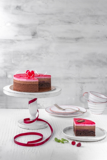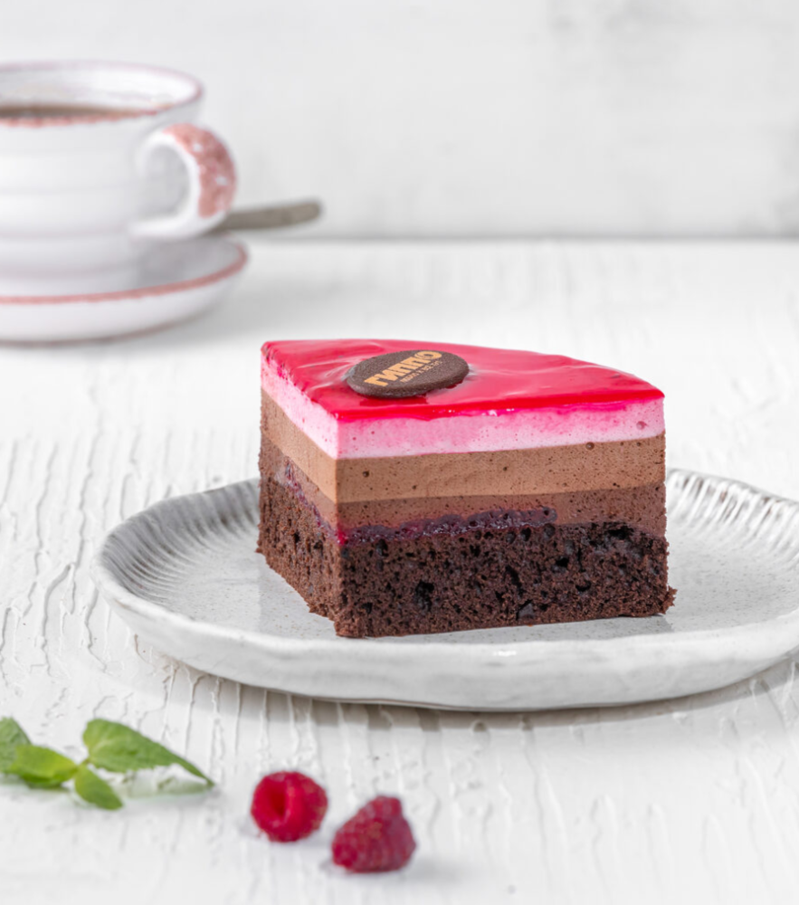 Воздушный шоколадный бисквит, пропитанный сладким сиропом и покрытый малиновым пюре. Для объемного вкуса в торт добавлены три слоя крема: нежнейшее крем-суфле «Тёмный шоколад», вторым слоем нанесен крем-суфле «Молочный шоколад», а на верхний положили легкое малиновое суфле. Торт обрамлен фруктовым гелем и украшен мармеладными ягодами «Малина».